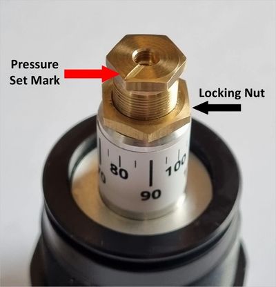 The Evo Regulator is equipped with a pressure scale on the neck and a set mark on the top of the brass set screw as indicated by the red arrow in the picture. This enables you to re-adjust or fine-tune your regulator exactly to your specifications. The picture shows the set mark pointing to 80bar. The 2023 regulator also includes a 12mm locking nut as indicated by the black arrow in the picture - this locks your reg pressure setting into place and reduces regulator "creep" and inaccuracies found in other regulators.